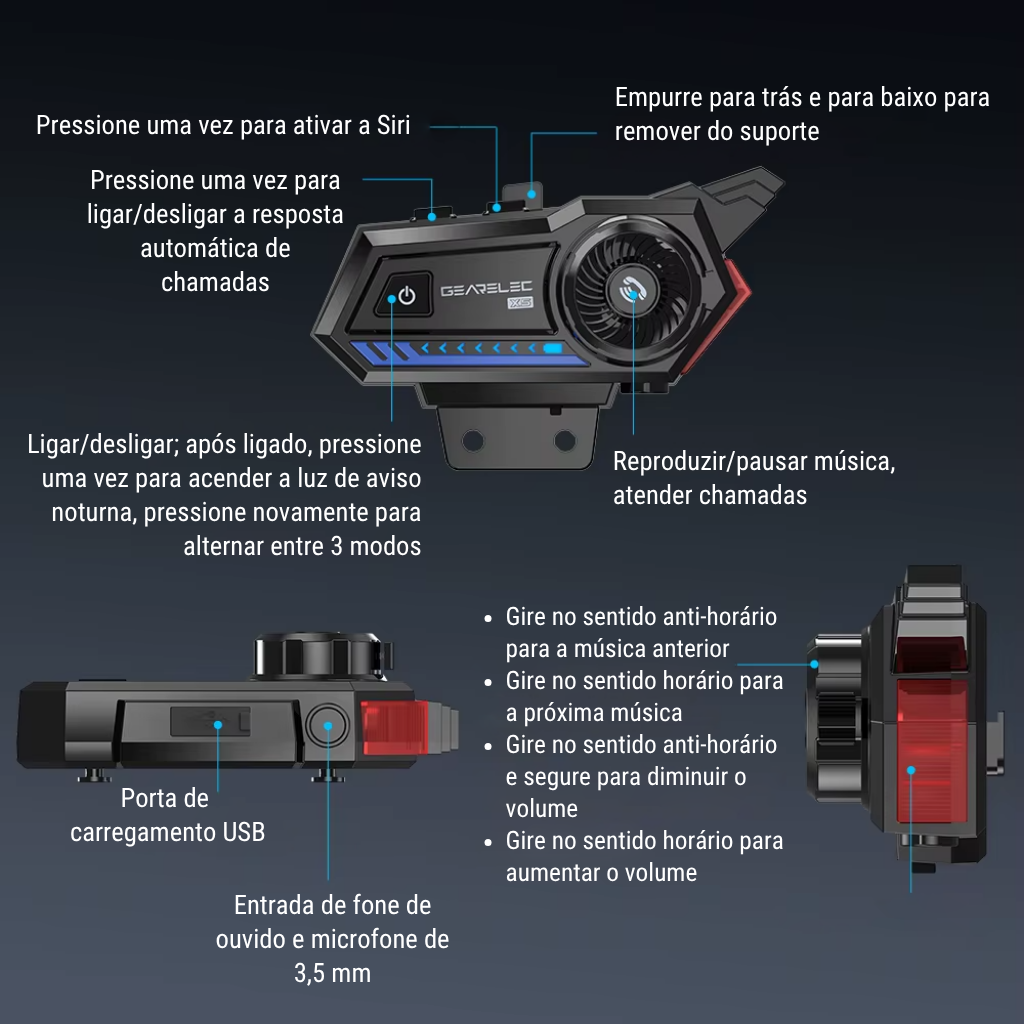 Desenvolvido para os amantes de aventura e liberdade, o GEARELEC X5 é a combinação perfeita de tecnologia e praticidade, transformando suas viagens de moto em experiências inesquecíveis.